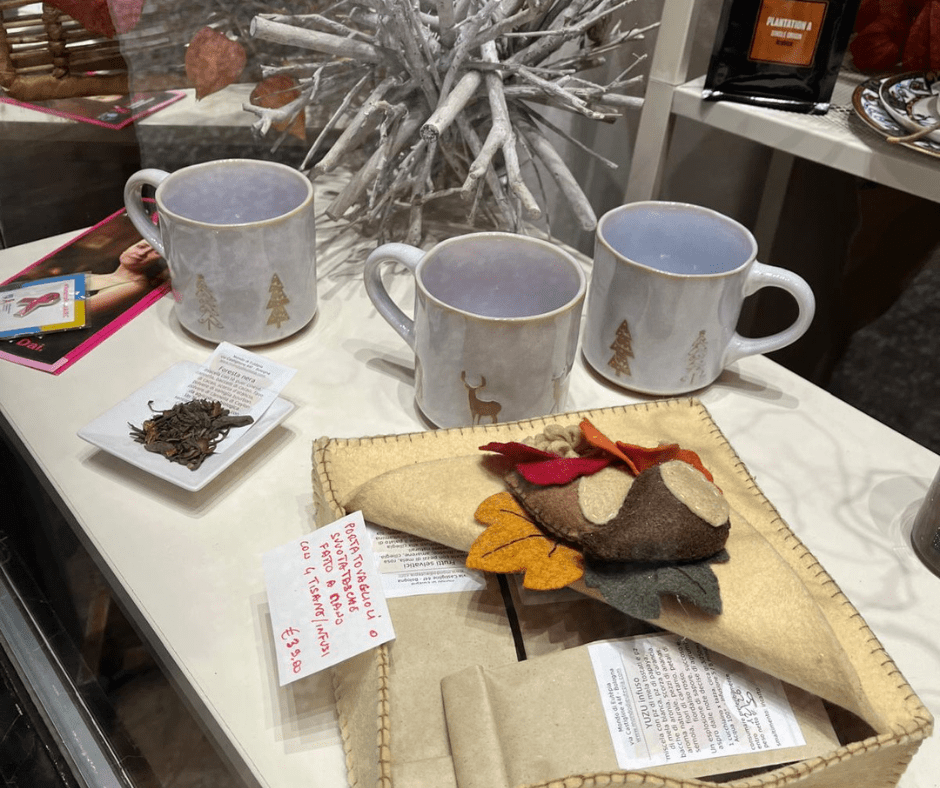 Un grande classico resta la tazza con tè o tisana, arricchita quest’anno da un tocco speciale: le tazze artigianali dell’Associazione Terra Verde, decorate con parole evocative come “Sogno”, “Emozioni”, “Infinito” o “Rivoluzionaria”, rendono ogni momento di pausa un’esperienza che unisce riflessione e piacere sensoriale. E per chi ama il caffè, Daniela propone le selezioni della torrefazione bolognese Caffè Lelli, perfette per chi desidera regalare aromi caldi e intensi, capaci di coccolare corpo e spirito.