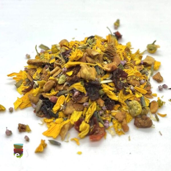 Ingredienti: pezzi di mela tostata, petali di fiori di girasole, camomilla, lavanda ed erica, rosa canina, aromi naturali.
