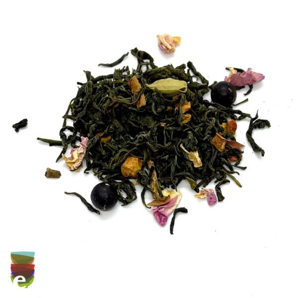 Ingredienti: Tè verde cinese, scorza d’arancia, ribes nero, pompelmo, vaniglia, cannella, mela, rosa iraniana, chiodi di garofano, aromi naturali da coltivazione biologica.