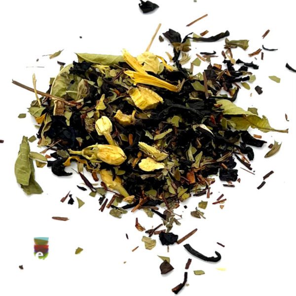 Ingredienti: tè neri dello Sry Lanka e Cina, rooibos Dop, matè verde, melissa, gelsomino, ananas, guava, anice stellato, liquirizia *, vaniglia, fiori di calendula, aromi naturali.